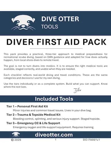 The Diver First Aid Pack is a practical, three-tier approach to medical preparedness for recreational scuba diving, based on DAN-style guidance and adapted for how dives actually happen, from local shore dives to remote travel. The goal is not to turn divers into medics. It is to ensure the right tools are available, staged correctly, and usable when they are needed. Use the tiers individually or as a complete system.