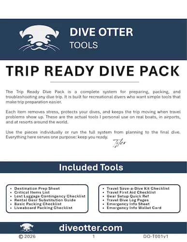 A complete system for preparing, packing, and troubleshooting any dive trip. It is built for recreational divers who want simple tools that make trip preparation easier. Each item removes stress, protects your dives, and keeps the trip moving when travel problems show up. These are the actual tools I personally use on real boats, in airports, and at resorts around the world. Use the pieces individually or run the full system from planning to the final dive. Everything here serves one purpose: keep you ready.